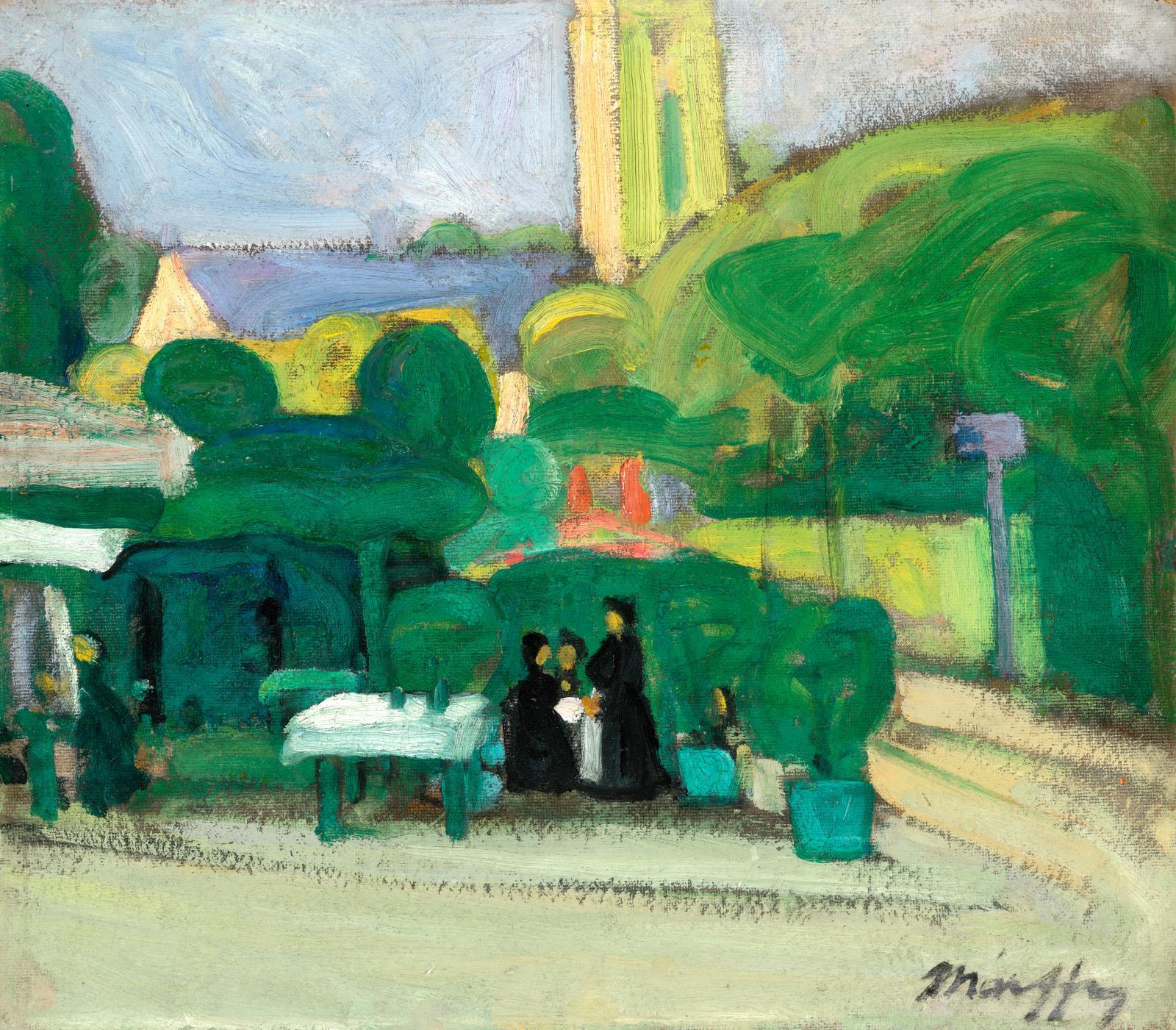 Jelezve jobbra lent: Márffy, Hátoldalon: cédulatöredék: „Rész…Me…”, cédulatöredék: 183, nyomtatott szám: 1564, tintaceruza felirat: 5096, 1564, ceruzafelirat: Horánszky u. Márffy, vakkereten: MNG bsz: 1945/977: „Tájkép alakokkal”, Életműkatalógus-szám: 4.1.3 (Rockenbauer, 2006.)