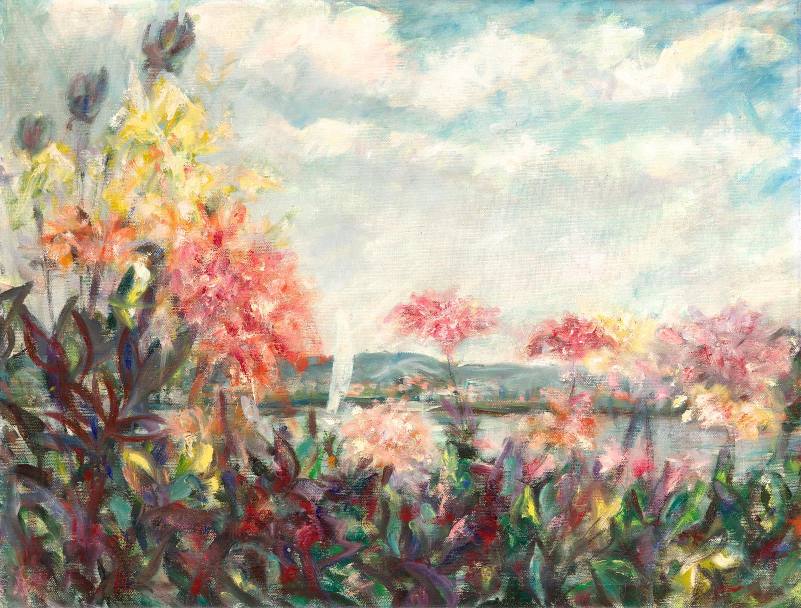 52 Halápy János: On the Shores of Lake Balaton (A White Sailboat Emerging from Behind Flowers)