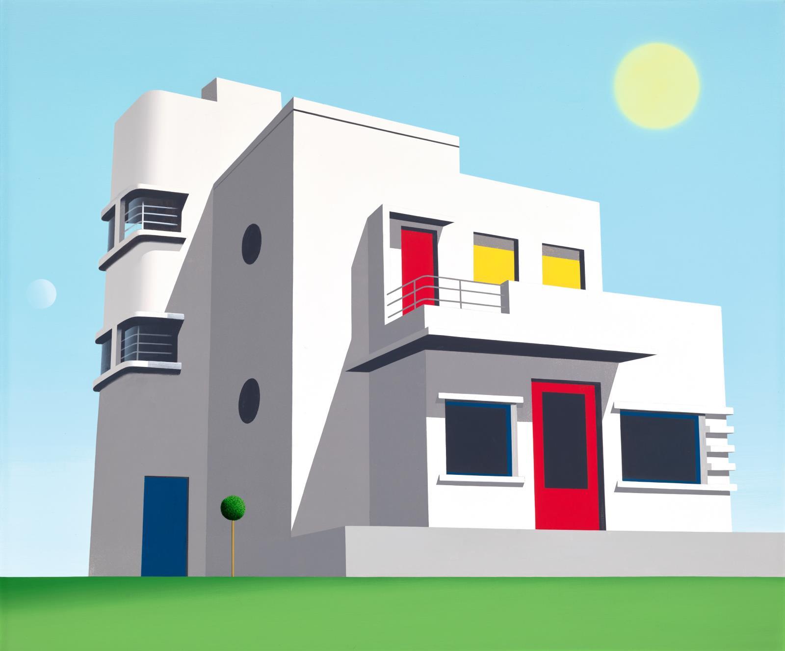 Jelezve a hátoldalon: Regős István „Bauhaus/ Tengerparti ház” (2021-22) 100x120cm akril, vászon