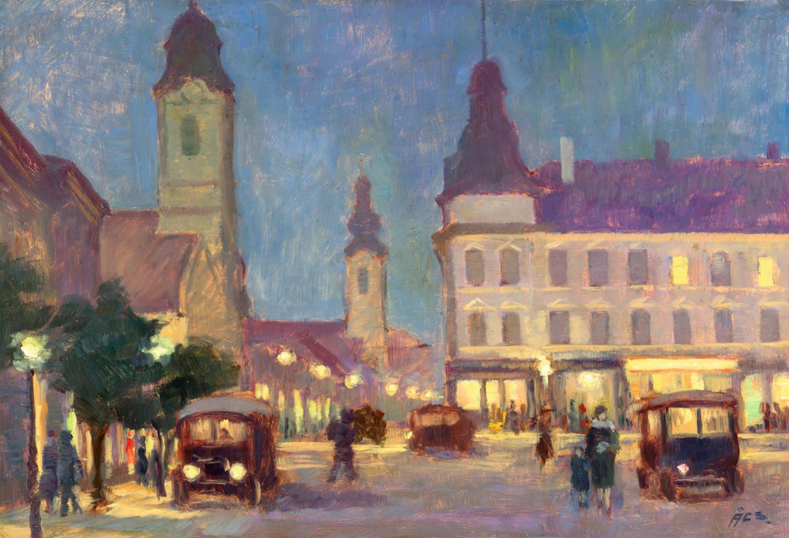 57 Ács Ferenc: The Main Square of Kolozsvár in the Evening, c. 1930