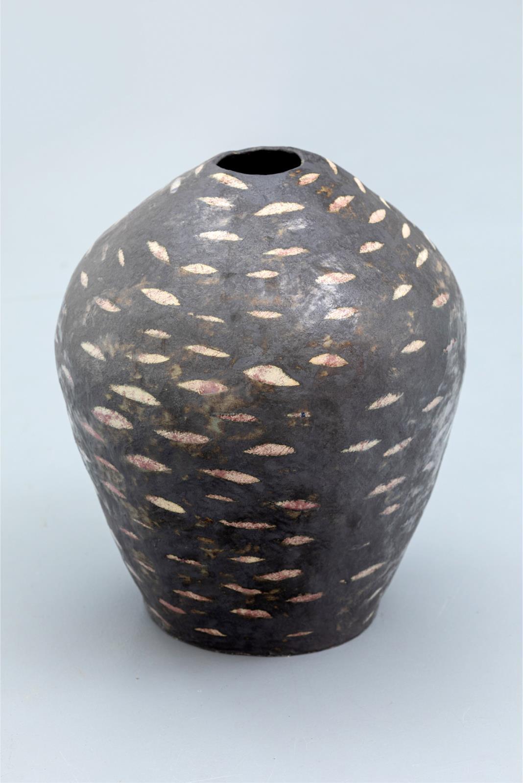 24 Ember Sári: Large Black Vessel with Many Pink Eyes (2023)