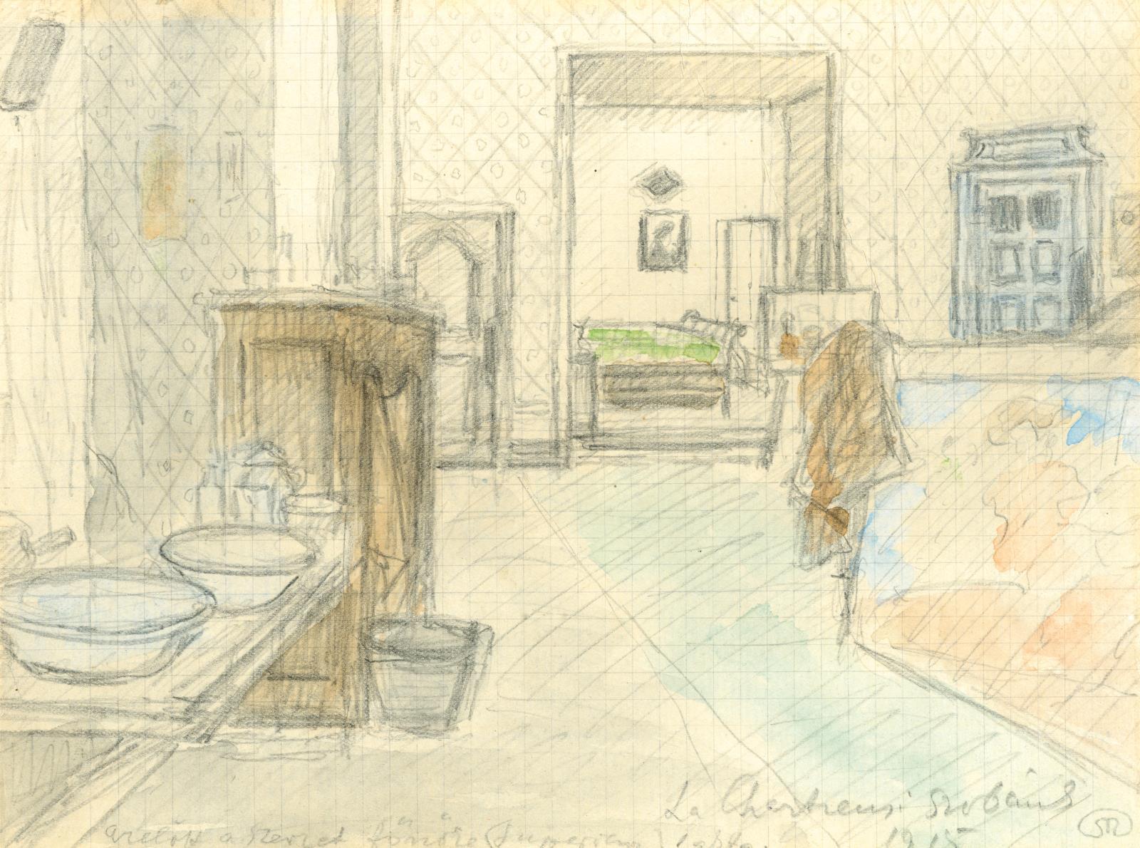 Jelezve jobbra lent: RRJ, Jelezve lent: La Chartreusi szobánk azelőtt a szerzet főnöke (Superior) lakta, 1915/ Signed lower right: RRJ, Signed lower: La Chartreusi szobánk azelőtt a szerzet főnöke (Superior) lakta, 1915