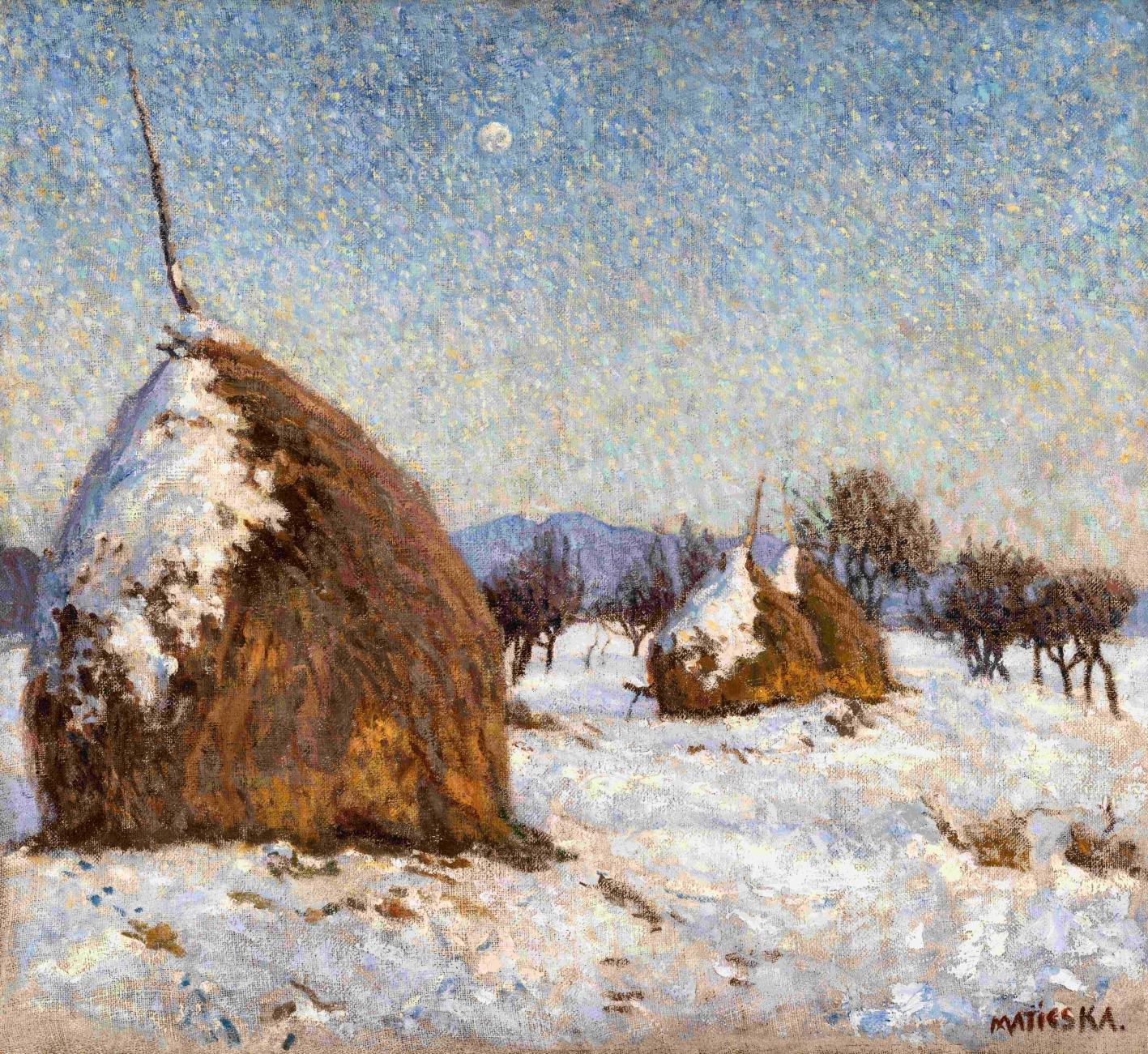 Kiállítva: Képkiállítás. Nagybánya, Iskolaműterem, 1911. május 7-16. Kat. sz.: 10. Téli táj boglyákkal, Prihradny Kálmán tulajdona