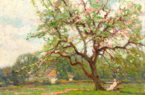 175 Bosznay István: Under the Foliage (Woman in Pink Hat Sitting on a Bench), 1922