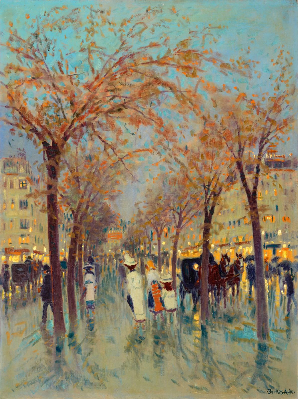 223 Berkes Antal: Parisian Street in Evening Lights, 1913