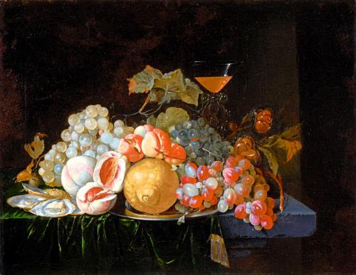 243 Ismeretlen 17. századi festő: Fruit Still-Life on Green Drapes with Oysters and Red Wine
