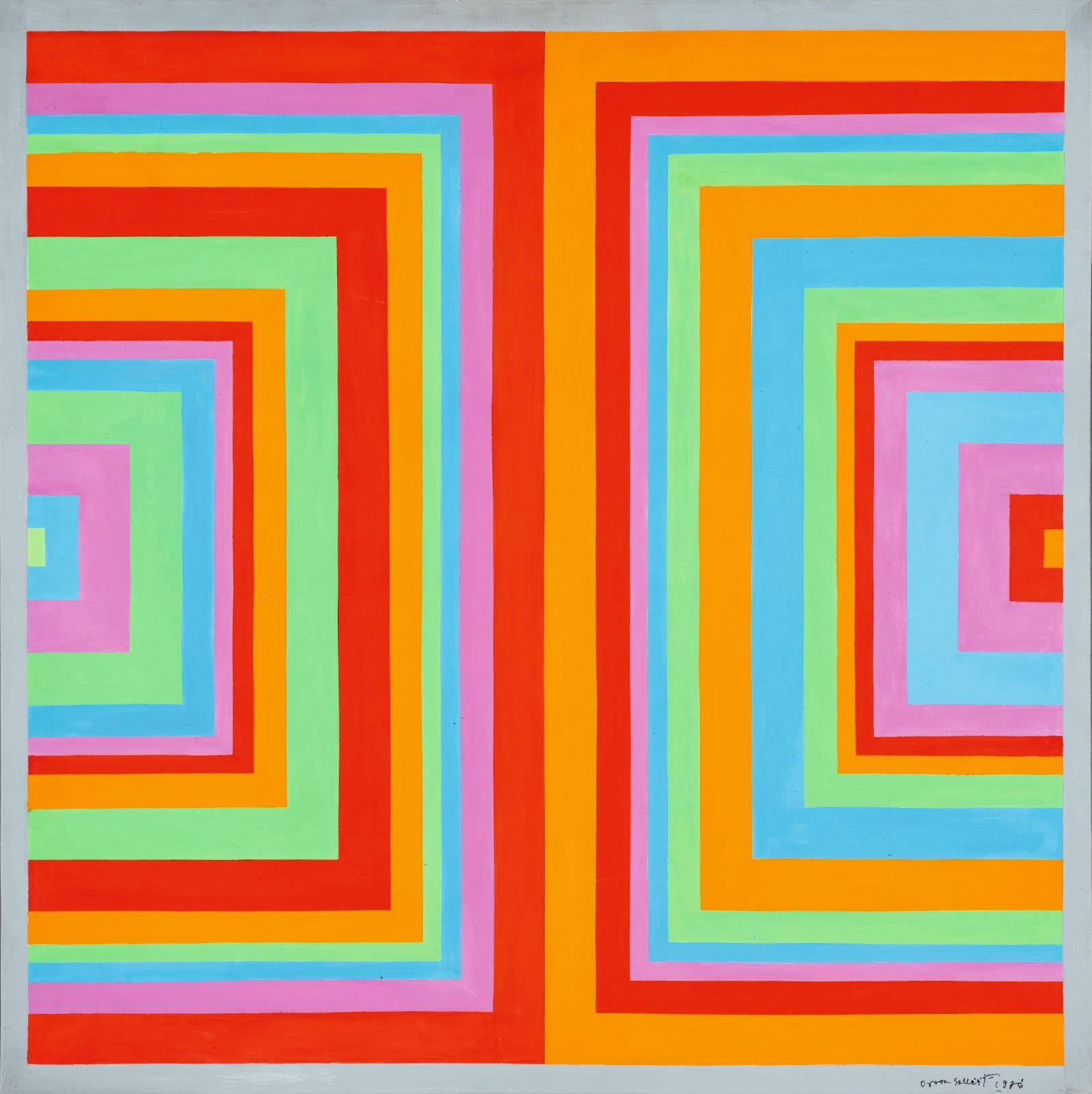 Jelezve jobbra lent: Orosz Gellért 1976, Hátoldalon a vakrámán autográf felirat: Orosz Gellért OH 471 III. 1976 akril 80x80 cm; töredékes Műcsarnok kiállítási raglap