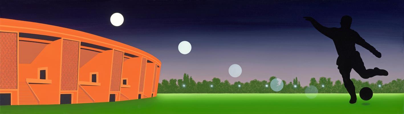 Jelezve a hátoldalon: Regős István "Futballegenda" (Puskás Ferenc emlékére 150x55 cm, Akril, vászon 2010)