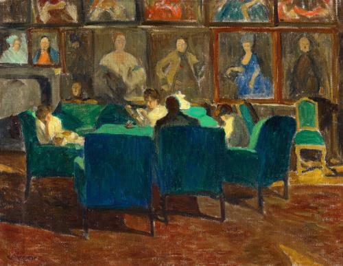 182 Konstantin Frida: A nagyőri kastély könyvtárszobája (A zöld garnitúra, pertóleum lámpa), 1910-es évek
