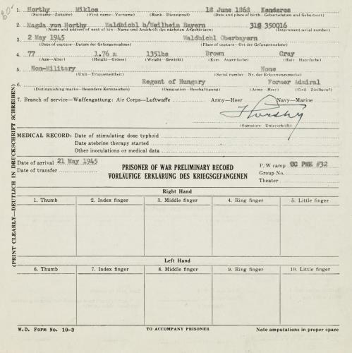 A hadifogoly Horthy (Horthy Miklós amerikai hadifogoly-bejelentő lapja, 1945. május 2.)