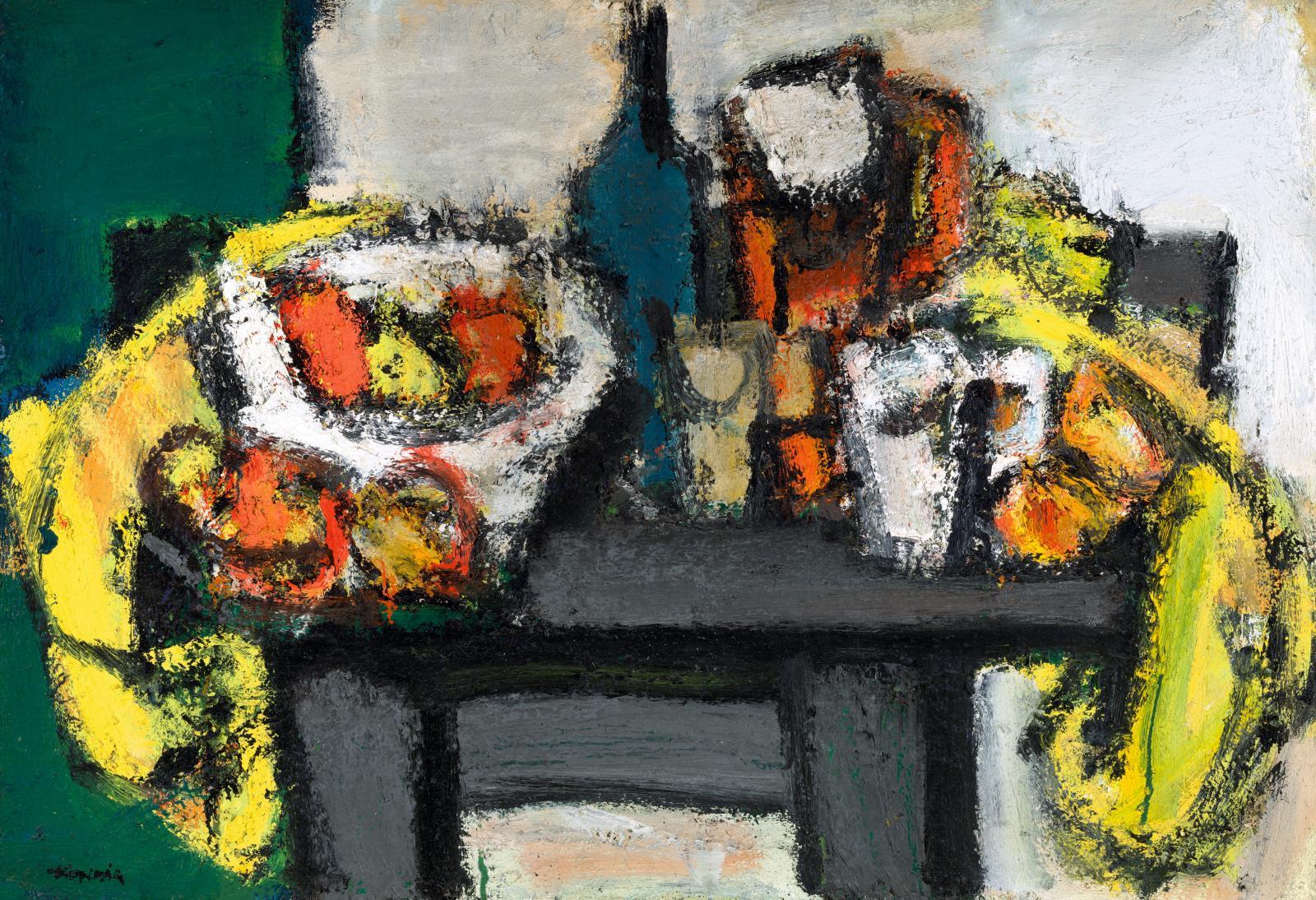 75 Konfár Gyula: Csendélet sárga drapériával és borosüveggel