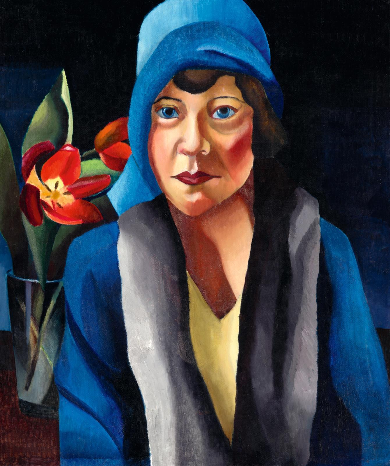 109 Ismeretlen magyar vagy francia festő, 1920-as évek: Art deco nő kék kalapban szélnyíló vörös tulipánnal