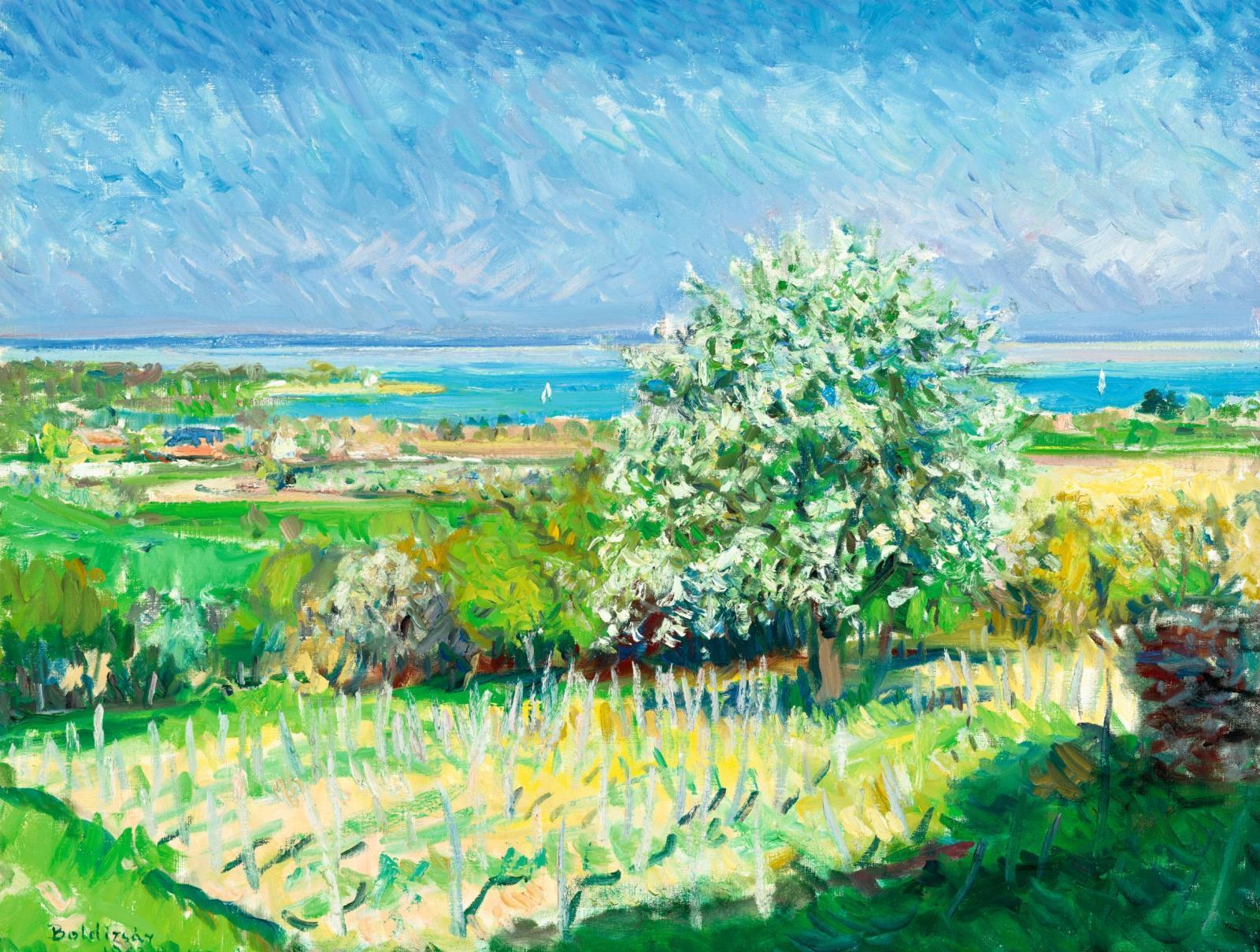 183 Boldizsár István: Virágzó fák háttérben a Balatonnal (Balatonarács), 1963