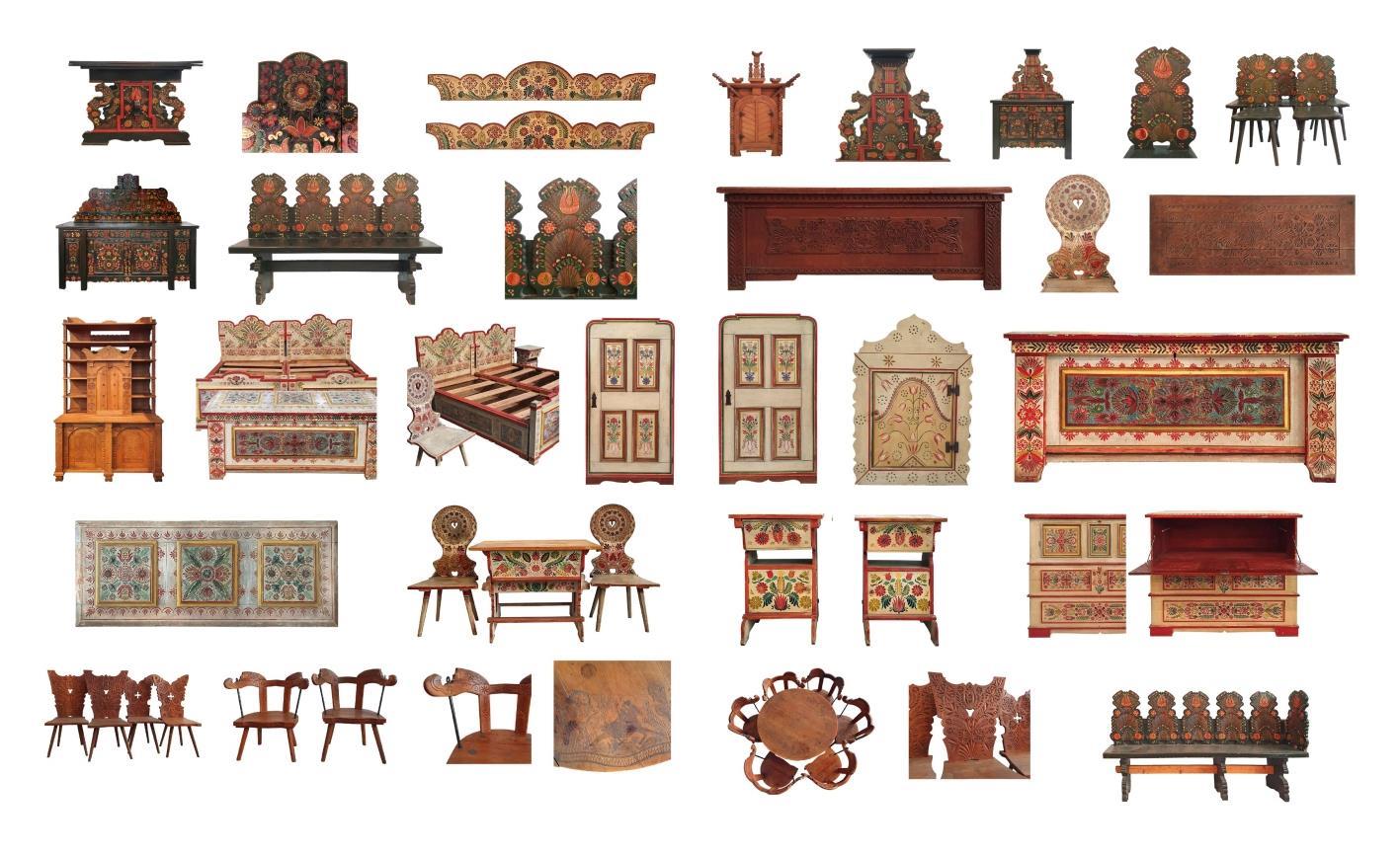 62 Sztelek Dénestervei és faragása, Nagy Sándor dekorterve: A gödöllői Gellér család otthonának eredeti állapotú berendezése - Összesen 40 darab bútor