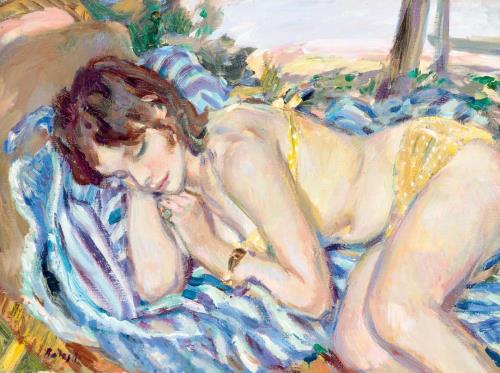 18 Balogh András: Pöttyös fürdőruhás pihenő lány a Balatonparton, 1970 körül