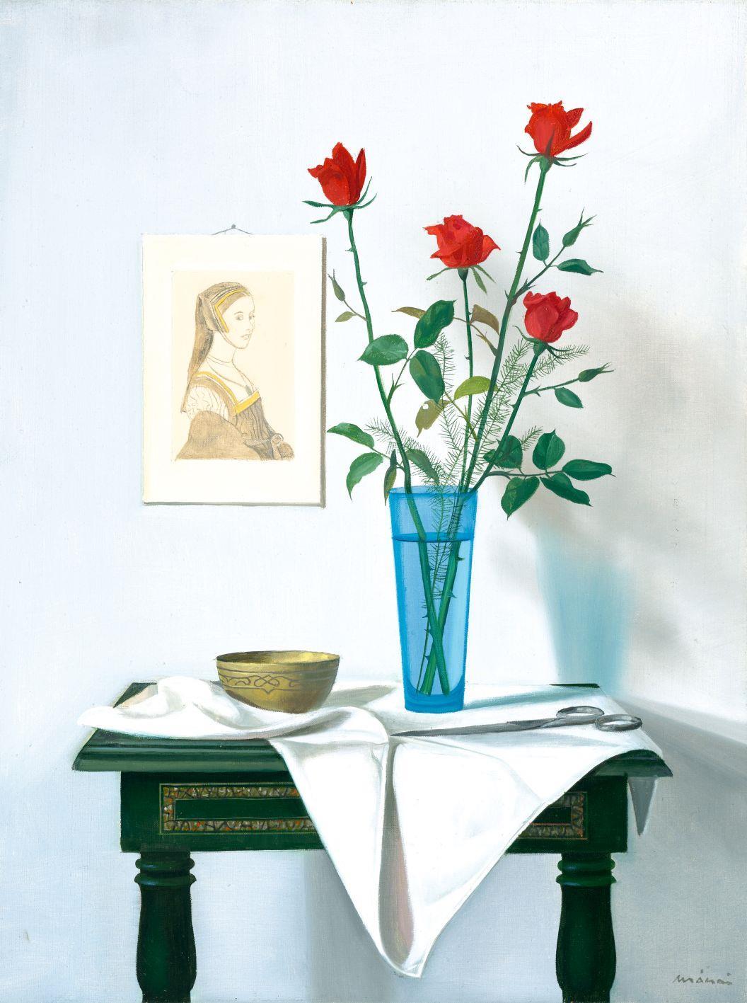51 Mácsai István: Csendélet vörös rózsával és fiatal lányt ábrázoló Holbein grafikával a háttérben