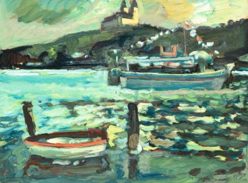 53 Schéner Mihály: Nyári alkonyati fények a Balatonon (Tihany), 1980 körül