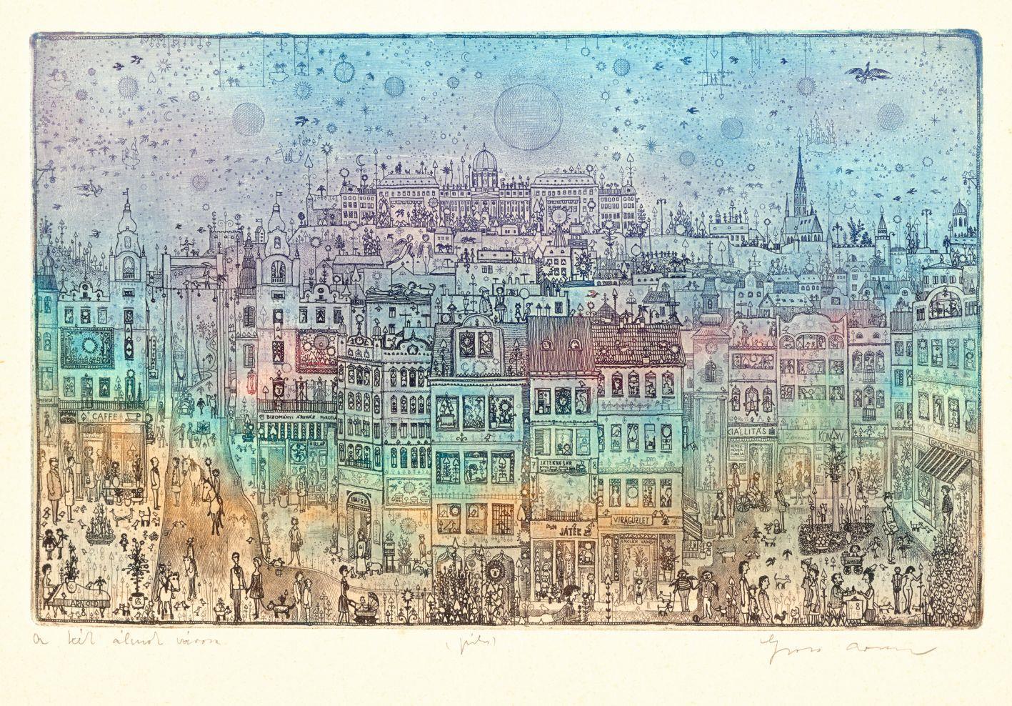 Jelezve balra lent: A kék álmok városa, Jelezve középen lent: próba, Jelezve jobbra lent: Gross Arnold/ Signed lower left: A kék álmok városa, Signed lower middle: próba, Signed lower right: Gross Arnold