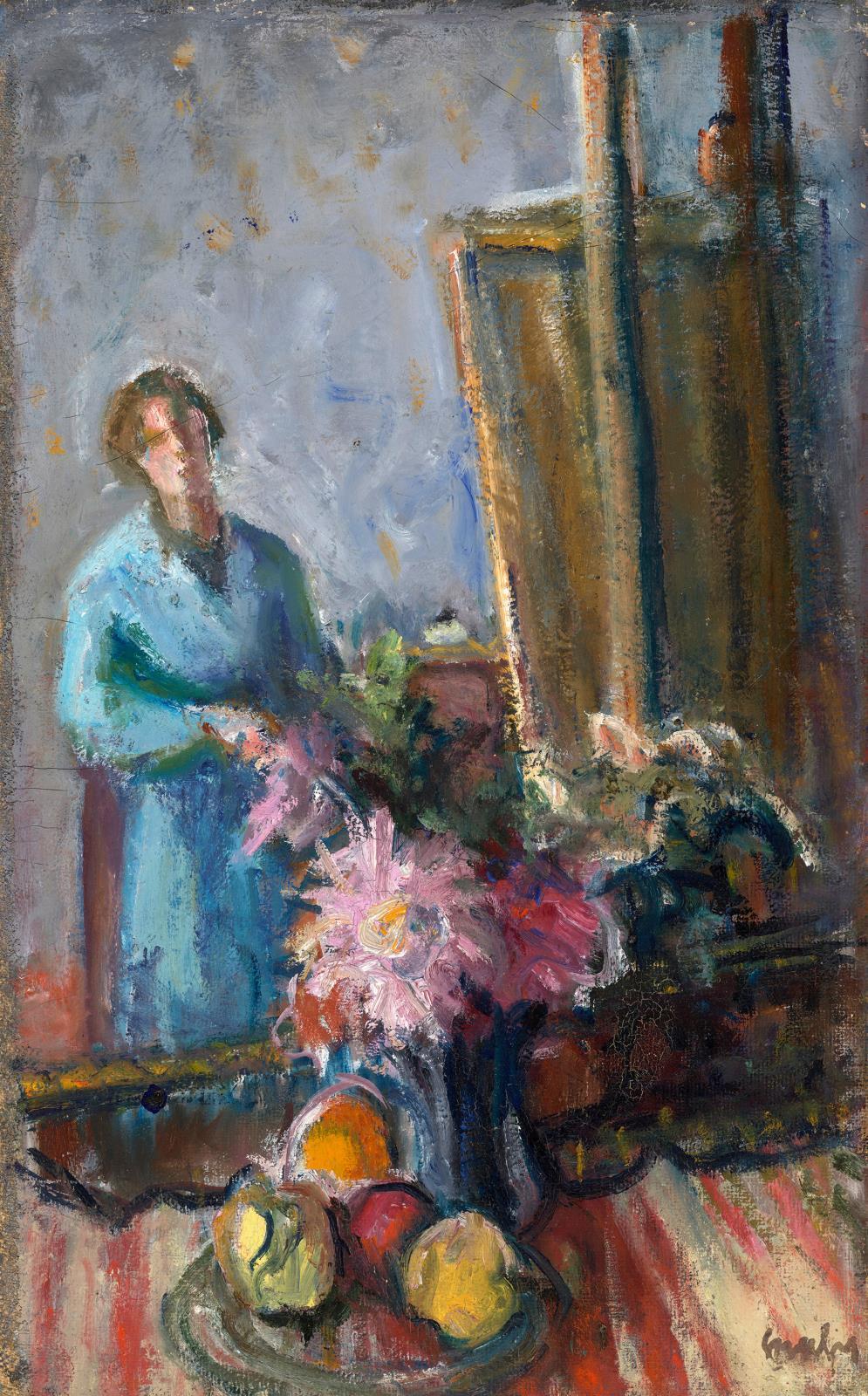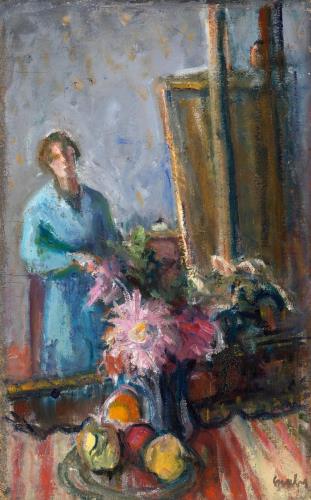 101 Gráber Margit: Önarckép festőállvánnyal és virágokkal