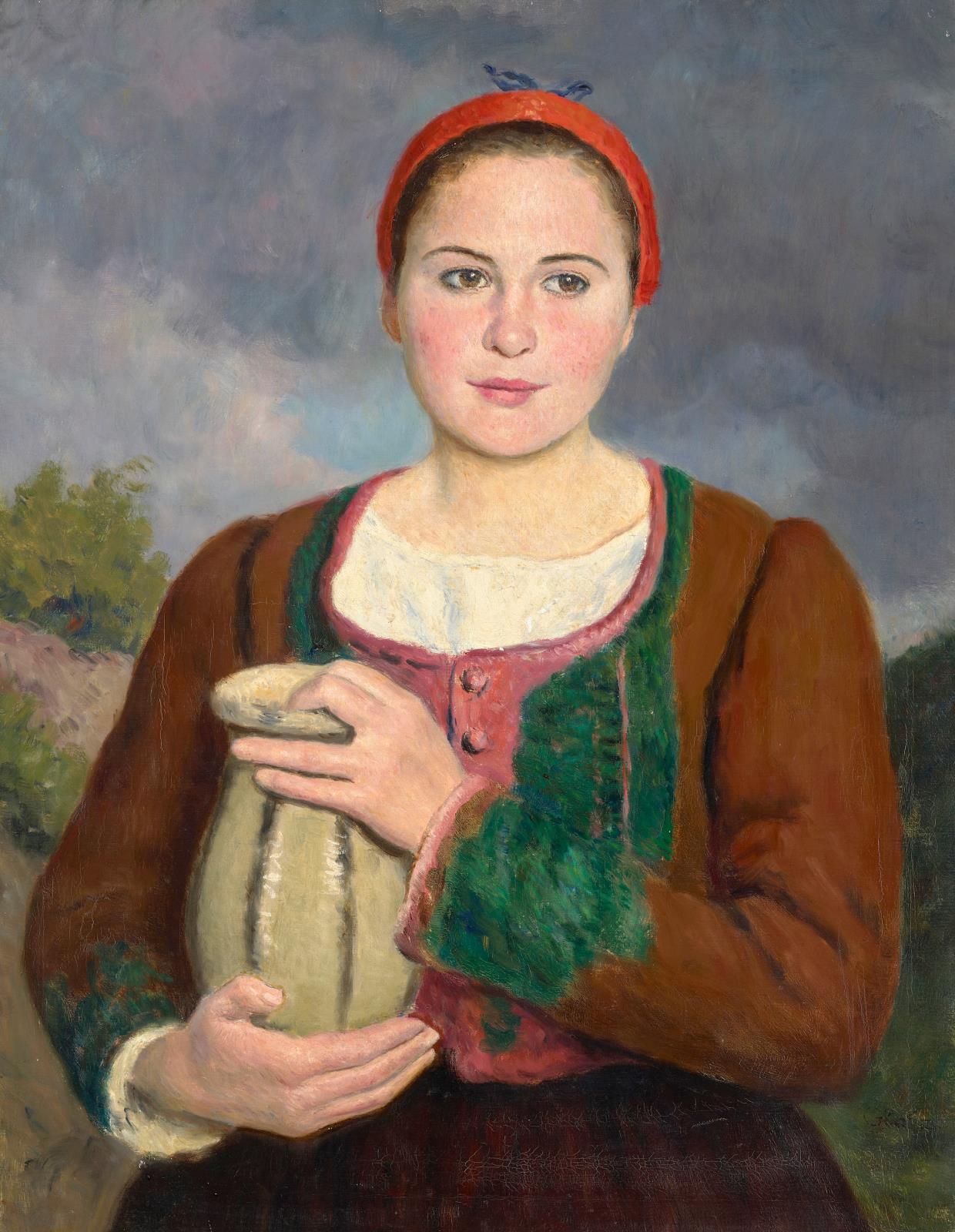 132 Glatz Oszkár: Fiatal lány piros főkötővel, 1930-as évek